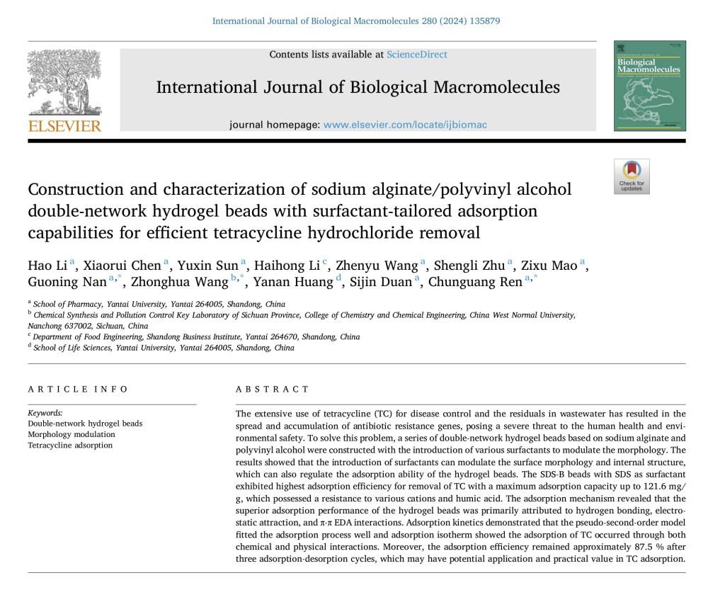 近日,新新漫画 2021级生物制药专业本科生李浩为第一作者,新新漫画 教师任春光、南国宁以及西华师范大学王中华教授为共同通讯作者,以“基于表面活性剂调控的海藻酸钠/聚乙烯醇双网络水凝胶微球的制备及其对四环素盐酸盐高效吸附性能的研究”为题,在国际权威期刊《国际生物大分子杂志》(中科院一区TOP)发表研究论文。