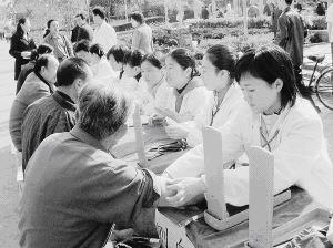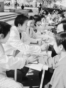 图为师生正在为市民量血压、提供用药咨询。