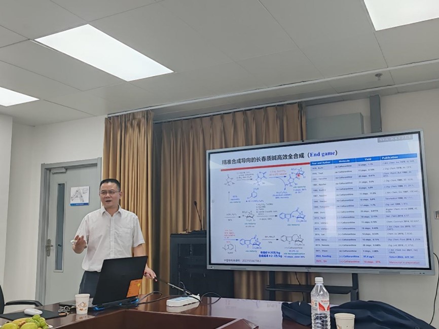 秦勇教授作了题为“精准合成化学导向的天然产物全合成-从基础研究到产业应用”的学术报告,报告会主要从基础研究和产业应用两个方面进行分享。秦勇教授以颠覆性的精准仿生合成技术改变吗啡类药物的产业模式为例,详细介绍了其团队从基础研究到产业应用的研究过程。同时,秦勇教授还以基础与应用并行的天然产物全合成为例,介绍其团队在减重药奥利司他、抗凝血药磺达肝奎钠等复杂结构的天然药物产业化方面的进展。报告结束后,秦教授与在场师生展开探讨交流,现场氛围热烈活跃。