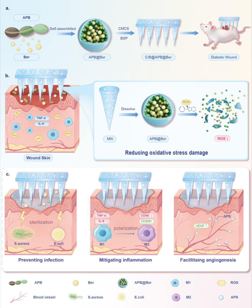 图1.负载APB@Ber的MNs贴剂促进伤口愈合的示意图