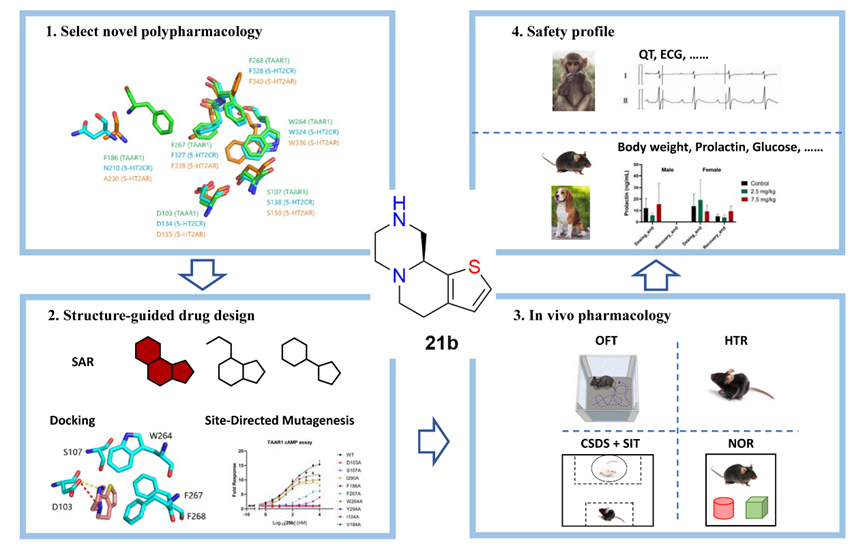 近日,新新漫画 /分子药理和药物评价教育部重点实验室田京伟/张剑钊/芦静团队与绿叶制药集团创新研究院,首次发现微量胺相关受体1 (Trace-amine associated receptor 1, TAAR1)和5-HT2C受体(5-hydroxytryptamine receptor 2C, 5-HT2CR)的相似结合模式,用于新一代治疗精分药物/阿尔茨海默病精神病性障碍等疾病研发。芦静带领药物设计团队基于人工智能药物设计和计算机辅助药物设计(AIDD/CADD)获得全球首个双靶点激动剂,表现出对TAAR1和5-HT2CR高特异性的强激动活性,在多种药效学模型展现出显著优于目前临床用药的特征;已在中国和美国进入临床I期多剂量递增(MAD)研究阶段,临床前和初步临床结果显示耐受性和安全性良好,未出现抗精分药物常见的锥体外系不良反应、血脂代谢异常、体重增加等副作用,被行业列为具有“重磅炸弹”潜力的分子。这一重要的科研成果不仅为精神分裂症和阿尔茨海默病精神病性障碍等患者提供了新的治疗选择,也为未来药物研发提供了创新策略。